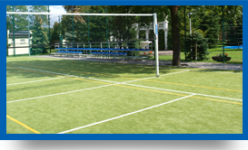 Oświetlone boisko wielofunkcyjne z trybunami. Profesjonalne boisko do siatkówki plażowej z piaskiem plażowym.